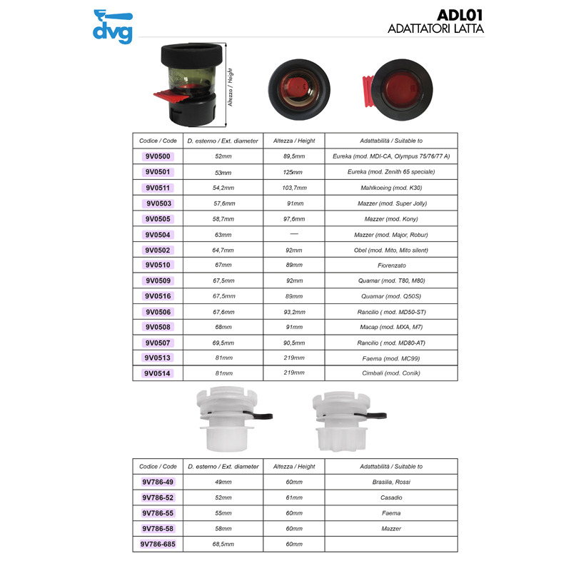 9V0500 COFFEE CANS ADAPTOR D.52MM CONICAL FOR EUREKA GRINDERS MOQ is also available with mixed models.Coffee cans adaptor.It fits Eureka (mod. MDI-CA, OLYMPUS 75/76/77 A) grinders. Go back Request info Warning! To make an order by using our Web Site and to check out our items, You need to get an account. Login Sign up